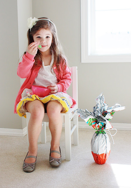 Lucy discovered that the Easter Bunny had hidden jelly beans all over the playroom. She had so much fun running around to find them. She was very proud of her little collection & very pleased with her big treat!